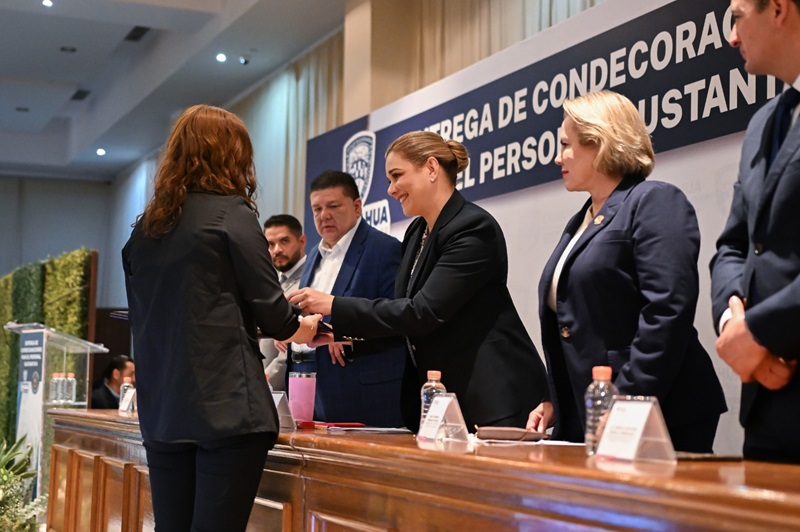 Chihuahua, Chihuahua – La gobernadora Maru Campos encabezó la entrega de 129 condecoraciones y estímulos a personal sustantivo de la Fiscalía General del Estado (FGE), por los méritos obtenidos y los años de servicio en la dependencia.