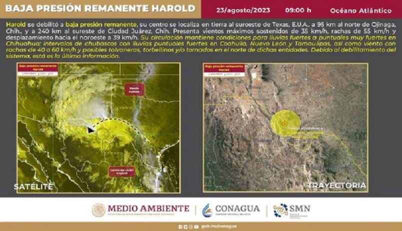 Chihuahua, Chihuahua – La depresión tropical Harold en combinación con el monzón mexicano, ocasionará lluvias puntuales a fuertes sobre localidades ubicadas en la zona norte del territorio estatal, dio a conocer la Coordinación Estatal de Protección Civil (CEPC).