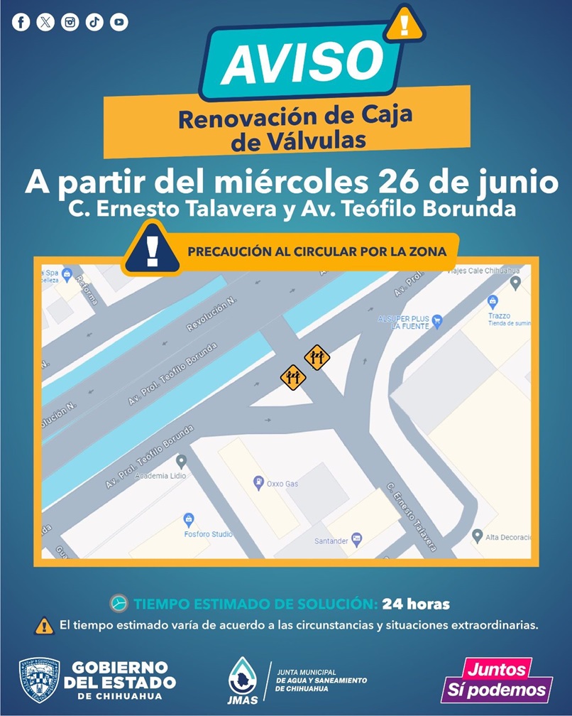 Ciudad Juarez, Chihuahua – La Junta Municipal de Agua y Saneamiento (JMAS) Chihuahua, informó que este miércoles 26 de junio, realizará la renovación de cajas de válvulas sobre la calle Ernesto Talavera y avenida Teófilo Borunda.