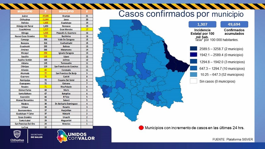 Los casos acumulados por municipio son: Ahumada 77, Aldama 145, Allende 84, Ascensión 66, Aquiles Serdán 160, Bachíniva 16, Batopilas 6, Bocoyna 316, Balleza 15, Buenaventura 37, Camargo 336, Carichí 8, Casas Grandes 33, Chihuahua 11,844, Chínipas 129, Coronado 11, Coyame del Sotol 8, Cuauhtémoc 1,517, Cusihuiriachi 15, Delicias 1,835, Dr. Belisario Domínguez 3, Galeana 7, Gómez Farías 68, Guachochi 295, Gran Morelos 17, Guadalupe 19, Guadalupe y Calvo 37, Guazapares 72 y Guerrero 75.