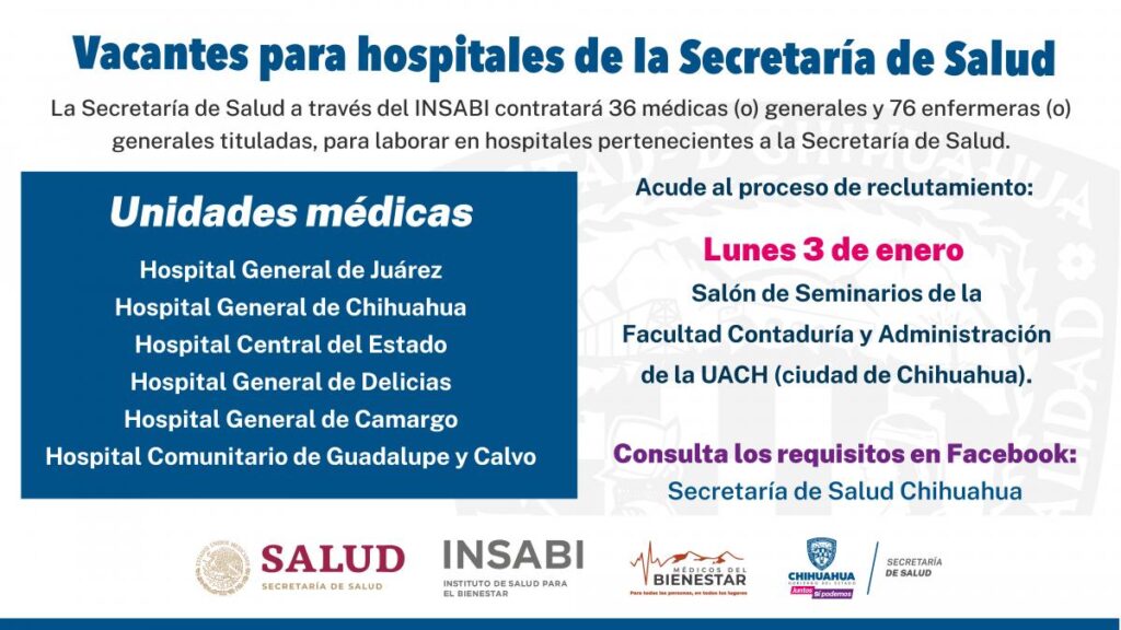 Chihuahua, Chihuahua.- La Secretaría de Salud a través del INSABI, realizará la contratación por seis meses de 36 médicos generales y 76 enfermeras generales titulados para laborar en hospitales de Juárez, Chihuahua, Delicias, Camargo y Guadalupe y Calvo.