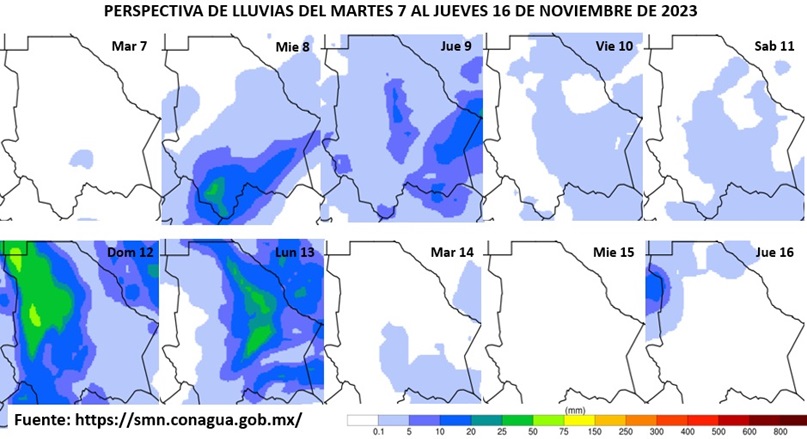 Para el miércoles 8 de noviembre. se esperan lluvias de dispersas a moderadas con chubascos de 5.1 a 25 milímetros en las zonas oeste, suroeste, sur y sureste, y de 2.1 a 5 milímetros en Chihuahua capital y en las zonas oeste, centro, sureste, y noreste; lluvias aisladas de 0.1 a 2 milímetros en zonas norte, noroeste, oeste, centro y sureste.