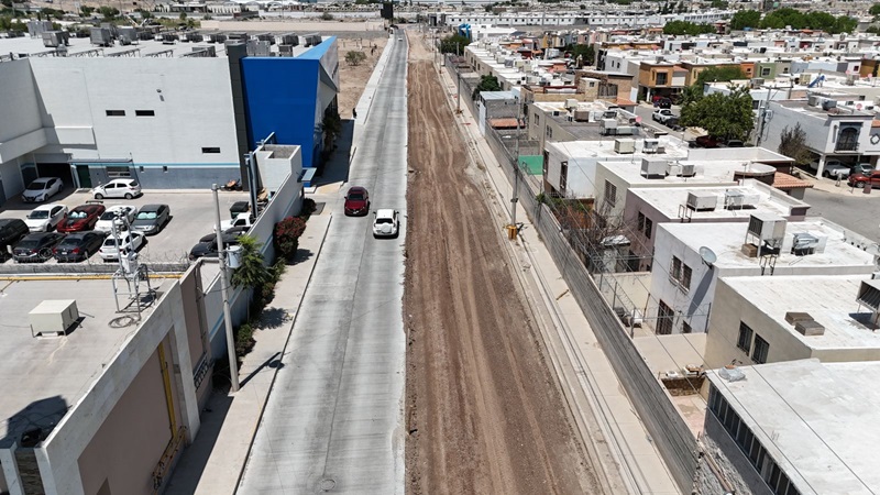 Ciudad Juarez, Chihuahua – La Dirección General de Obras Públicas avanza en los trabajos de pavimentación de la calle Camino San Carlos, reportando hasta este día un progreso del 60% en la mejora a esta vialidad, lo que permitirá el acceso a fraccionamientos del área de Jardines de San Carlos desde la avenida De las Torres.