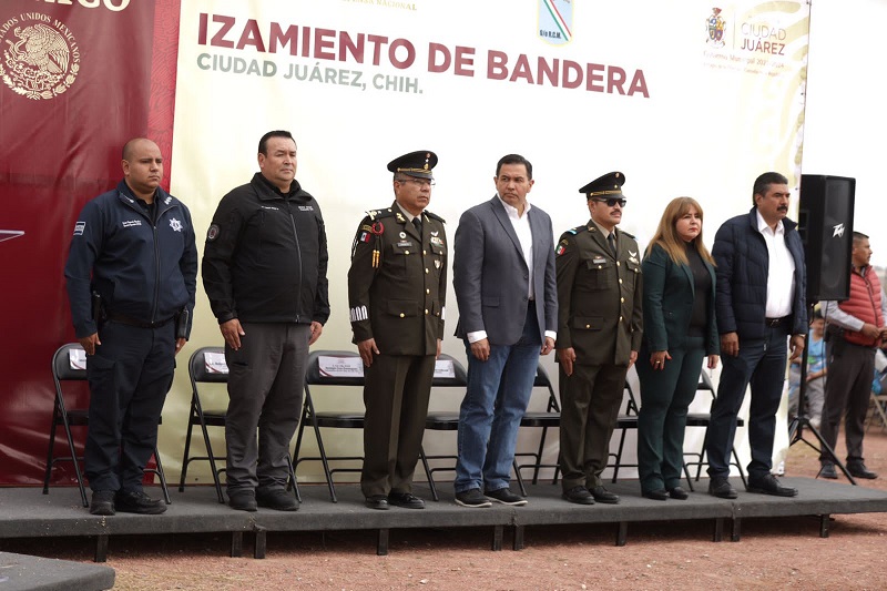 Ciudad Juárez, Chihuahua – Con la finalidad de fomentar el civismo y mantener el respeto a los símbolos patrios, el Gobierno Municipal, encabezado por el alcalde Cruz Pérez Cuéllar, celebró la última ceremonia de izamiento de bandera del año, evento que se llevó a cabo en la plaza de la Megabandera.
