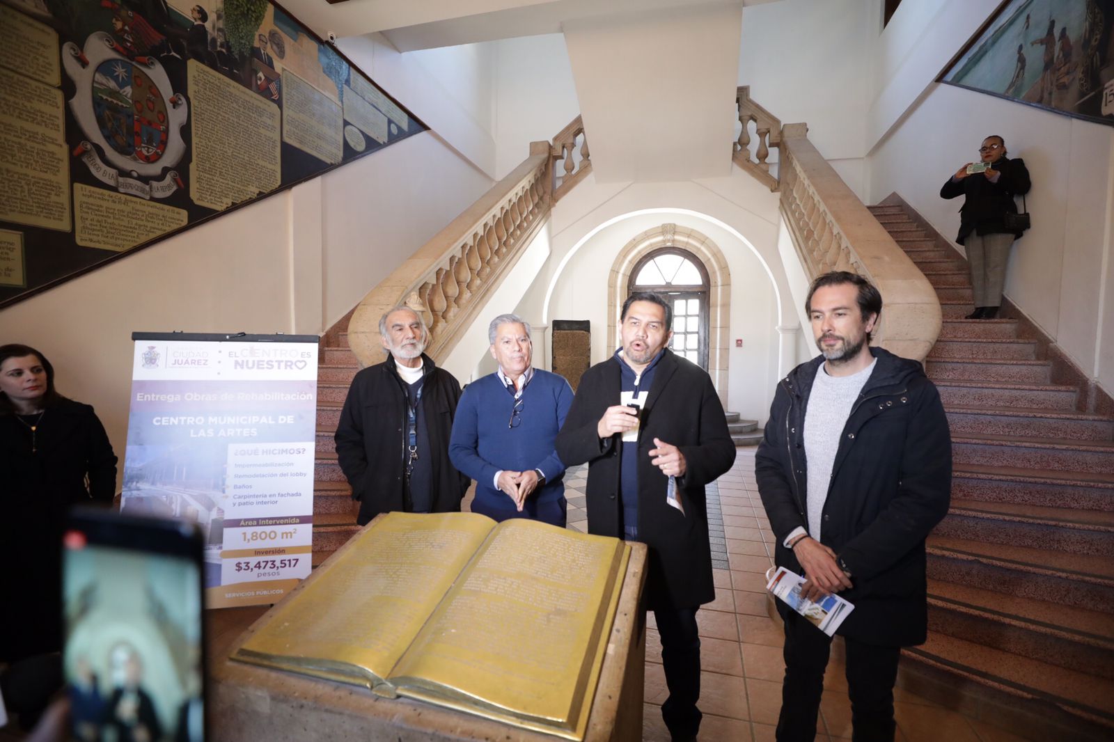 Ciudad Juárez, Chihuahua.- El Presidente Municipal, Cruz Pérez Cuéllar, entregó las obras concluidas correspondientes a la primera etapa de rehabilitación del Centro Municipal de las Artes (CMA), lo que beneficia directamente a los estudiantes de las distintas disciplinas artísticas que allí se imparten, en seguimiento a los trabajos para el rescate del Centro Histórico de la ciudad.