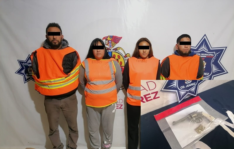 Ciudad Juarez, Chihuahua – Agentes de la Secretaría de Seguridad Pública Municipal arrestaron a Valerio C. C., Maurilio R. G., Laura Delfina A. R., Maritza Isela R. A. y un adolescente de 17 años, por su presunta responsabilidad en la comisión de delitos contra la ley federal de armas de fuego y explosivos.