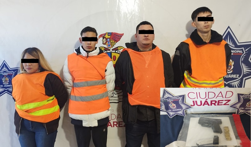 Ciudad Juarez, Chihuahua – Agentes de la Secretaría de Seguridad Pública Municipal arrestaron a Héctor H. H., Luis Brayan T. A., Zaira Alejandra A. B. y Alan Uriel G. A., por su presunta responsabilidad en la comisión de los delitos de lesiones y contra la ley federal de armas de fuego y explosivos.