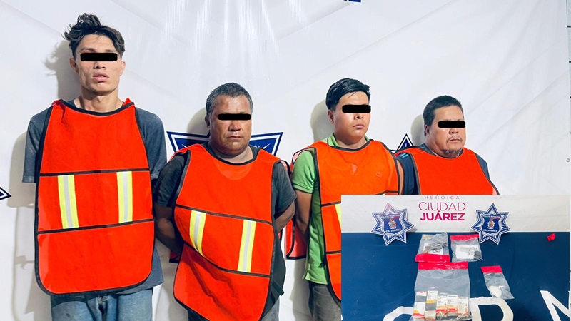 Ciudad Juarez, Chihuahua – Elementos de la Secretaría de Seguridad Pública Municipal arrestaron a José Carlos C. M., Marcos C. M., Brian Alfonso A. L. y Carlos Emmanuel C. A. por su presunta responsabilidad en la comisión de delitos contra la ley federal de armas de fuego y explosivos, contra la salud, lesiones y desobediencia y resistencia a particulares.