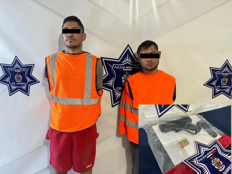 Ciudad Juarez, Chihuahua – Elementos de la Secretaría de Seguridad Pública Municipal capturaron a Jairo Samuel R. B. y Cristian Carlos O. G., por su presunta responsabilidad en la comisión de delitos contra la ley federal de armas de fuego y explosivos.