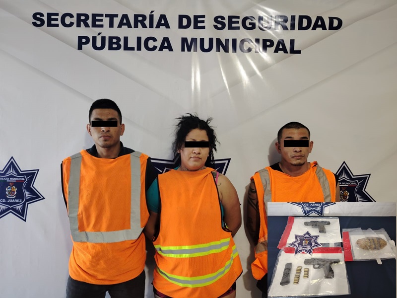 Ciudad Juarez, Chihuahua – Elementos de la Secretaría de Seguridad Pública Municipal arrestaron a Juan Antonio B. L., Lucia Elena V. H. y Julián Alejandro R. R., por su presunta responsabilidad en la comisión de delitos contra la salud y violación a la ley federal de armas de fuego y explosivos.