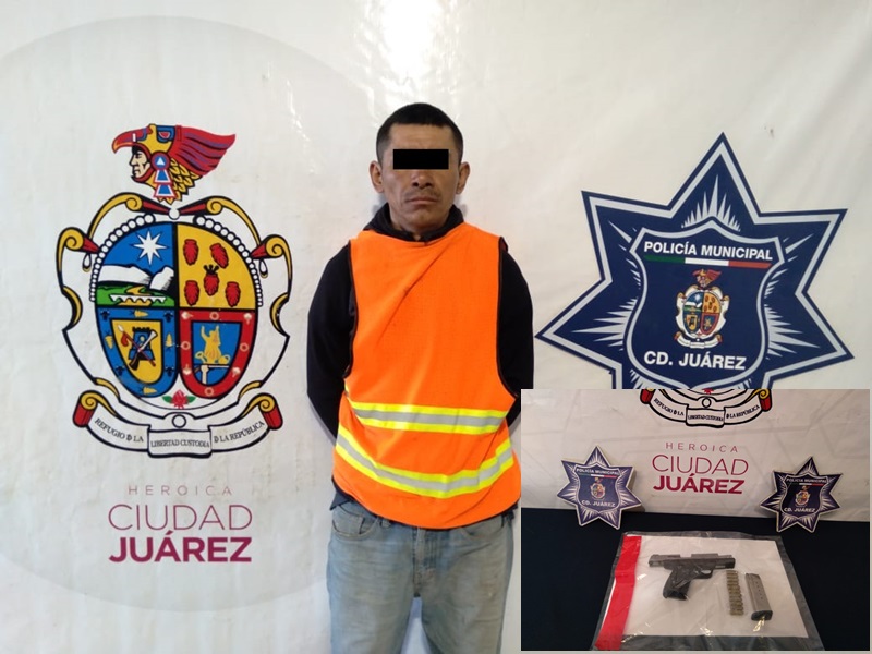 Ciudad Juarez, Chihuahua – Elementos de la Secretaría de Seguridad Pública Municipal arrestaron a Miguel Ángel M. S., por su presunta responsabilidad en la comisión de delitos contra la ley federal de armas de fuego y explosivos y robo a transeúnte con violencia en grado de tentativa.