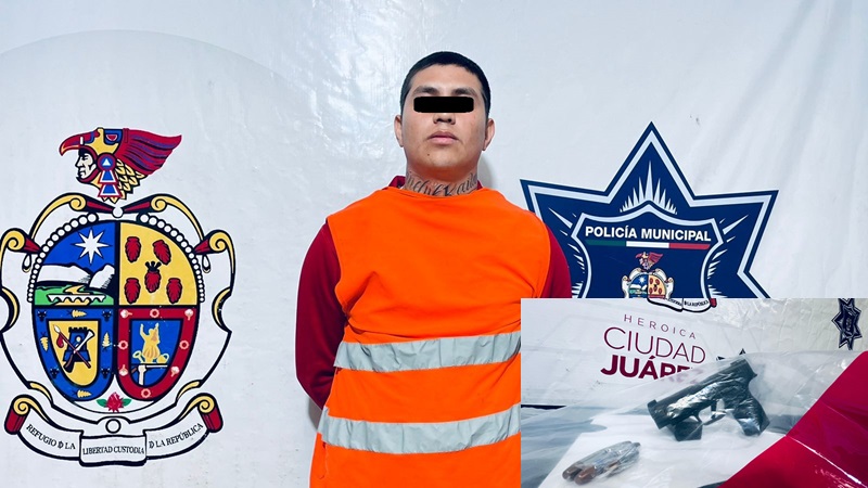 Ciudad Juarez, Chihuahua – Elementos de la Secretaría de Seguridad Pública Municipal arrestaron a Luis Mario G. M., por su presunta responsabilidad en la comisión de delitos contra la ley federal de armas de fuego y explosivos y violencia familiar.