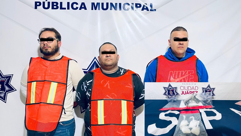 Ciudad Juarez, Chihuahua – Elementos de la Secretaría de Seguridad Pública Municipal arrestaron a Javier E. V., Ángel H. D. y Leobardo A. D., por su presunta responsabilidad en la comisión de delitos contra la ley federal de armas de fuego y explosivos y delitos contra la salud.