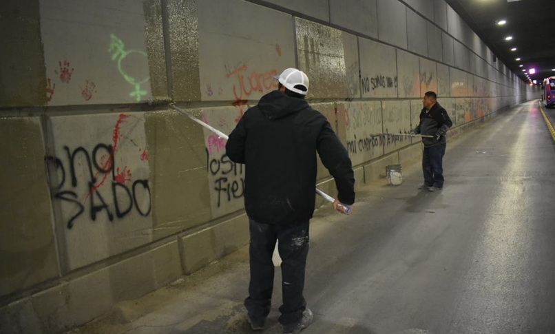 Ciudad Juarez, Chihuahua – El escuadrón antigrafiti de la Dirección de Limpia, atendió este lunes el Centro Histórico de la Ciudad, con retiro de pintas en los muros del paso a desnivel de la avenida 16 de Septiembre, dio a conocer Gibran Solís Kanahan, director de la dependencia.