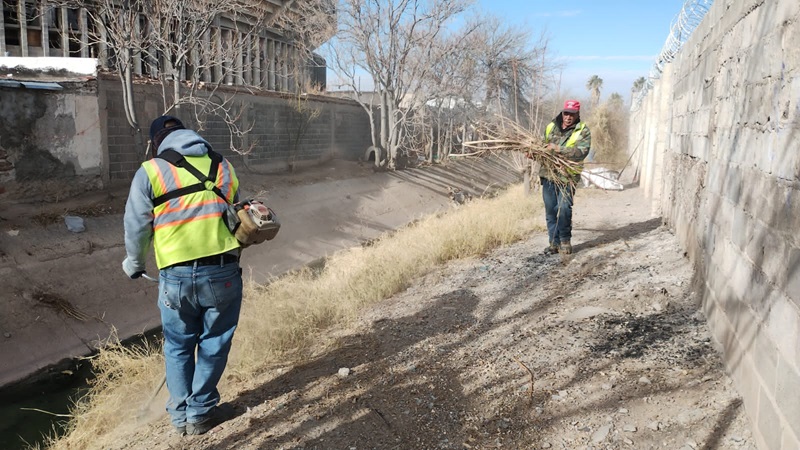 Ciudad Juarez, Chihuahua – Personal de la Dirección de Limpia continúa trabajando en la limpieza de la Acequia Madre, atendiendo este viernes el tramo del bulevar Bernardo Norzagaray hasta la calle Gregorio M. Solís.