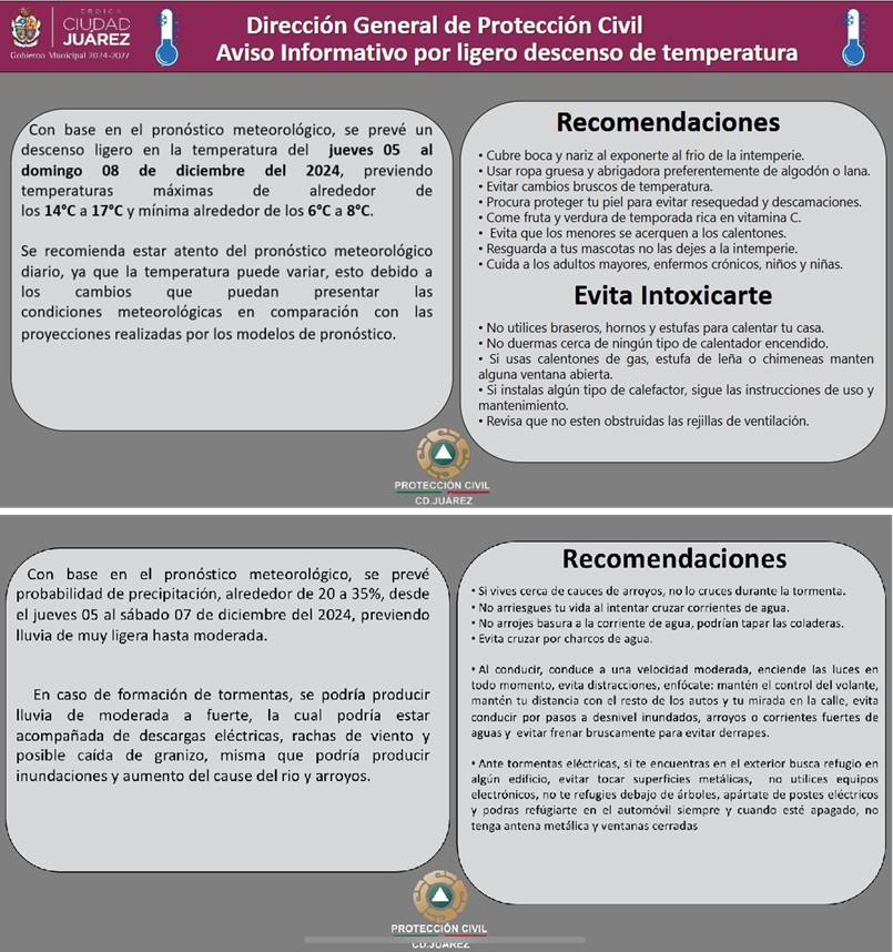 Ciudad Juarez, Chihuahua – La Dirección General de Protección Civil informa sobre las condiciones meteorológicas previstas para los próximos días. Entre el jueves 5 y el domingo 8 de diciembre de 2024, se espera un ligero descenso en las temperaturas, con máximas de 14°C a 17°C y mínimas de 6°C a 8°C. Adicionalmente, desde el jueves 5 al sábado 7 de diciembre, se prevé una probabilidad de lluvia ligera a moderada, con un porcentaje de entre el 20% y el 35%. En caso de formación de tormentas, podrían registrarse lluvias de moderadas a fuertes, acompañadas de descargas eléctricas, ráfagas de viento y posibles caídas de granizo.