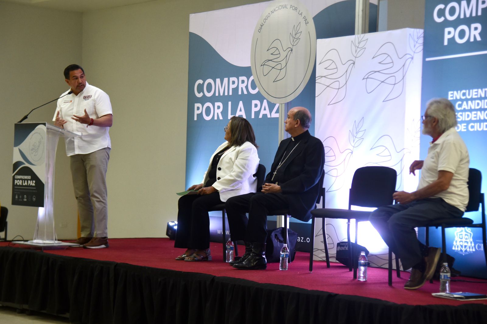 Además, del candidato Cruz Pérez Cuéllar y del Obispo José Guadalupe Torres Campos, en la firma del compromiso participaron Javier Ávila Aguirre, Padre Jesuita y representante del Diálogo Nacional de Paz, y María del Refugio García Sáenz, educadora y representante de la Red Nacional de Paz.