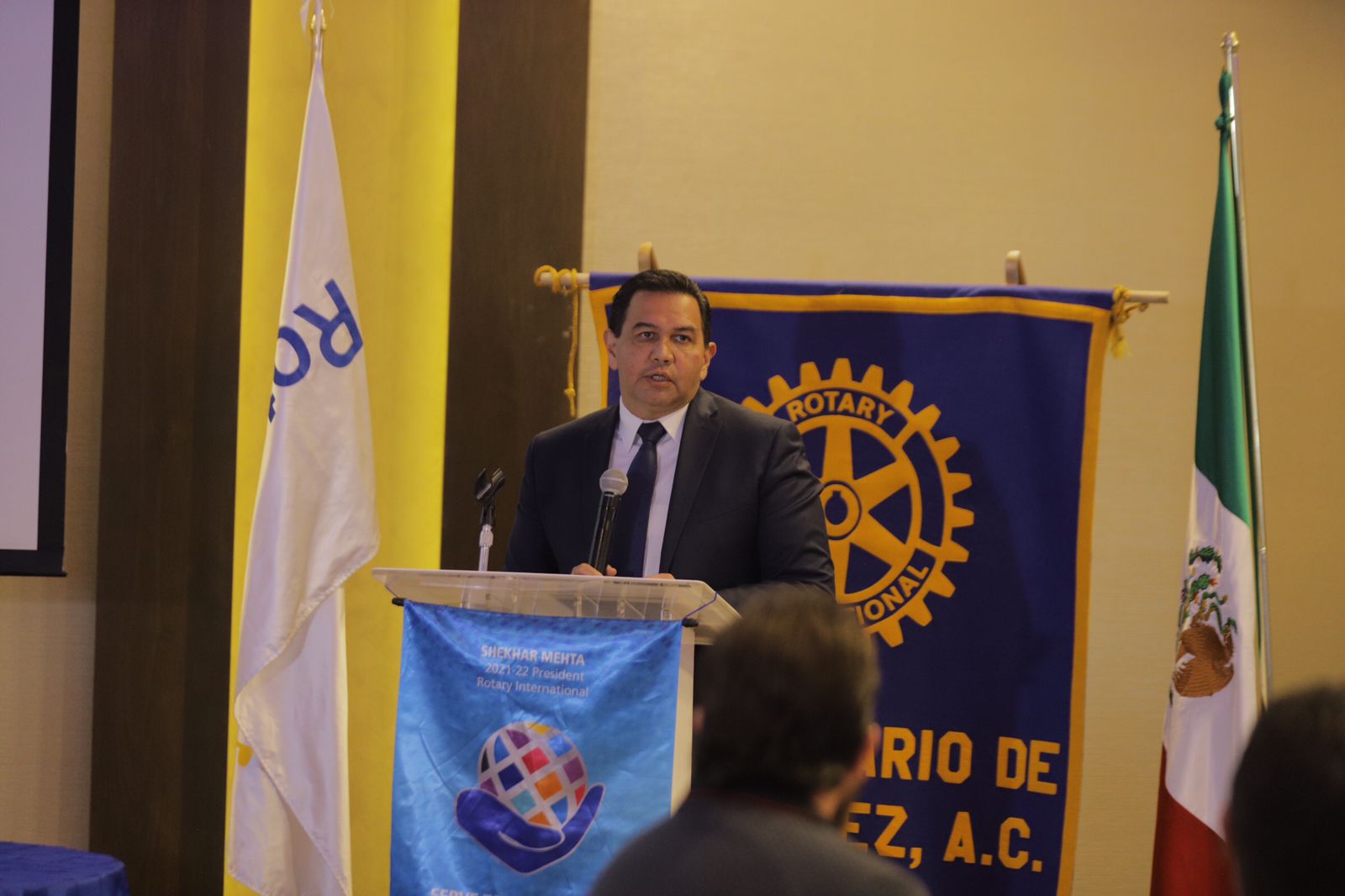 El secretario del Club Rotario de Ciudad Juárez, Julián Lara Gómez, dio la bienvenida al alcalde y reconoció la labor que ha venido desempeñando a favor de Ciudad Juárez, a través de los cargos públicos que ha tenido en los últimos años.
