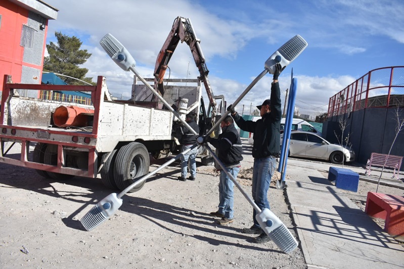 Ciudad Juarez, Chihuahua – La Dirección General de Servicios Públicos continúa complementando obras del Presupuesto Participativo, con acciones como limpieza, reparación de juegos e instalación de luminarias.