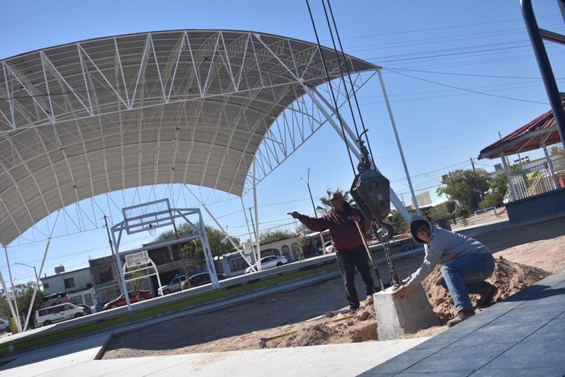 Ciudad Juarez, Chihuahua – Personal de la Dirección General de Servicios Públicos, permanece trabajando en el Parque Gladiolas ubicado en las calles Michoacán y Gardenia de la colonia Prados de Salvarcar, con labores complementarias de las obras que se efectúan con el programa de Presupuesto Participativo.