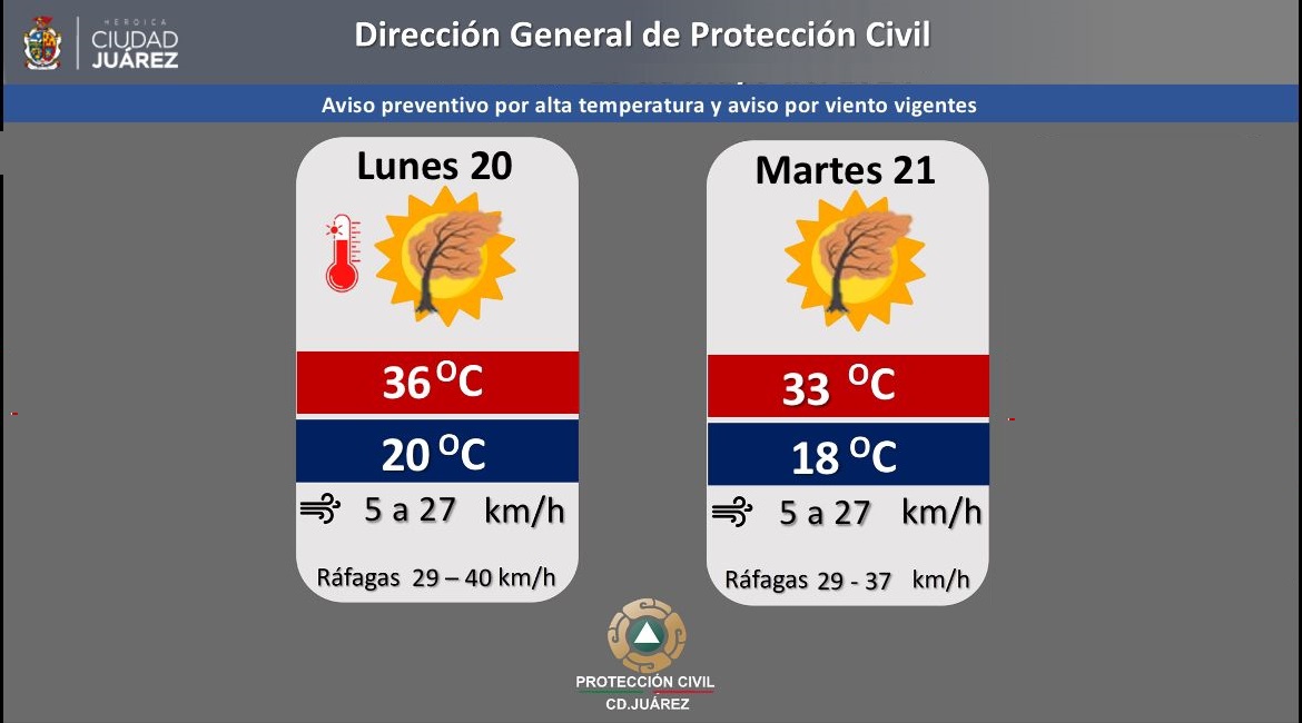 La Dirección General de Protección Civil informa que la temperatura máxima para hoy será de 36 grados Centígrados, mientras que la mínima está pronosticada en 20 grados durante la noche.
