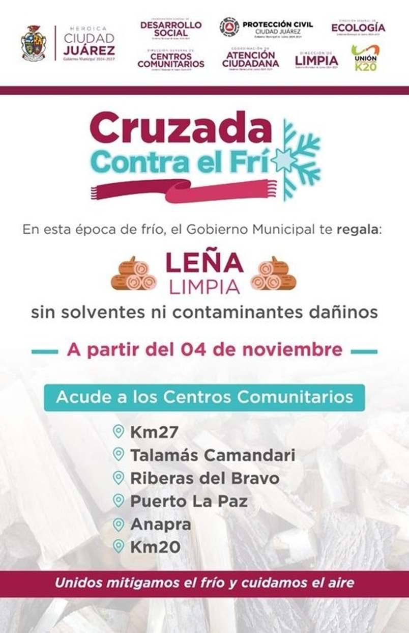 Jesús Manuel García Reyes, titular de la Dirección de Centros Comunitarios, explicó que la distribución de la leña se lleva a cabo en los siguientes puntos: Kilómetro 27 de la carretera a Casas Grandes, en el Centro Talamás Camandari, en Riberas del Bravo, Puerto La Paz, la colonia Anapra y en el kilómetro 20.