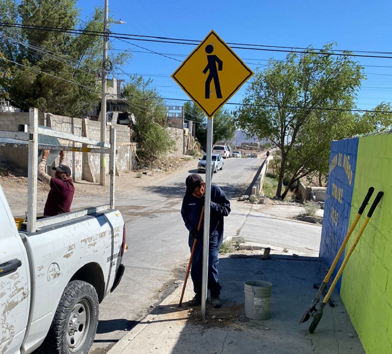 Ciudad Juárez, Chihuahua – Con la finalidad de resguardar la integridad física y reforzar la seguridad de la zona, personal de Control de Tráfico adscrito a la Coordinación General de Seguridad Vial colocó señalamientos peatonales y de zona escolar frente al Jardín de Niños Yumare número 1225, que se ubica en la colonia Plutarco Elías Calles sobre las calles Isla Barbados y General Treviño.