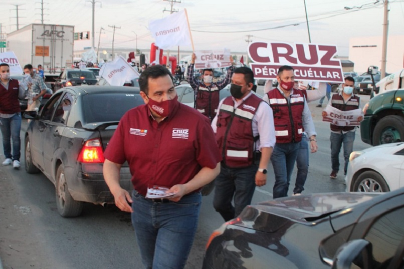 Ciudad Juárez, Chihuahua.- Cruz Pérez Cuéllar Candidato a la Presidente Municipal de Juárez por la Coalición “Juntos Haremos Historia en Chihuahua”, conformada por los partidos políticos Morena, PT y PANAL, acompañada de su esposa Rubí Enríquez y cientos de simpatizantes y militantes de la alianza, se dieron cita en Boulevard Independencia y Talamás Camandari.