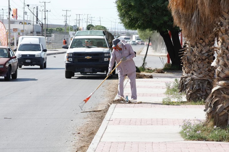 Con una cuadrilla a cargo se trabaja en la limpieza general con barrido manual, corte de césped, retiro de maleza y levantamiento de copa de los árboles de mezquite que se encuentran en el lugar, limpiando una superficie de alrededor de 400 metros de largo.