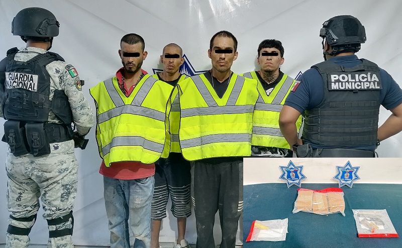 Ciudad Juárez, Chihuahua – Elementos de la Secretaría de Seguridad Pública Municipal (SSPM) en coordinación con personal de la Guardia Nacional (GN) capturaron a César René R. N, Jesús Adrián G. M., Ezequiel H. L. y Gerardo R. V., por su presunta responsabilidad en la comisión de delitos contra la ley federal de armas de fuego y explosivos, delitos contra la salud, posesión de vehículo con reporte de robo y daños al patrimonio municipal.