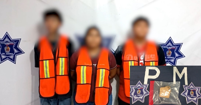 Ciudad Juarez, Chihuahua – Agentes de la Secretaría de Seguridad Pública Municipal arrestaron a Diego Andrés B. G., Ashley Lizeth G. C., Brandon Salvador B. V., y a un adolescente de 16 años, por su presunta responsabilidad en la comisión de delitos contra la salud; mismos que serán investigados por varios asaltos a tiendas de conveniencia.