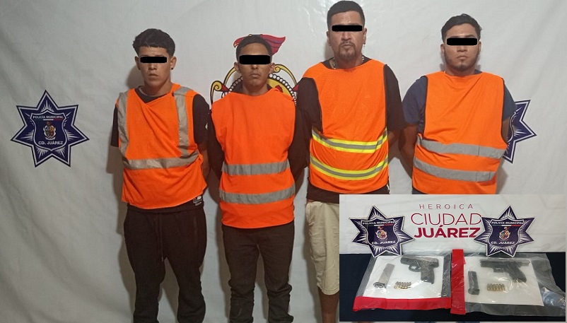 Ciudad Juárez, Chihuahua – Elementos de la Secretaría de Seguridad Pública Municipal arrestaron a Rodrigo R. C., Martín G. C., Ulises M. M. y Kevin Abraham G. M., por su presunta responsabilidad en la comisión del delito de privación ilegal de la libertad, delitos contra la ley federal de armas de fuego y explosivos y robo de vehículo con violencia.