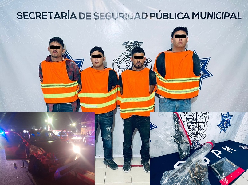 Ciudad Juárez, Chihuahua – Elementos de la Secretaría de Seguridad Pública Municipal arrestaron a Juan Daniel C. D., Issac Jesús R. R., Brian G. S. y Erick Roberto G. B., por su presunta responsabilidad en la comisión de delitos contra la ley federal de armas de fuego y explosivos y/o lo que resulte.
