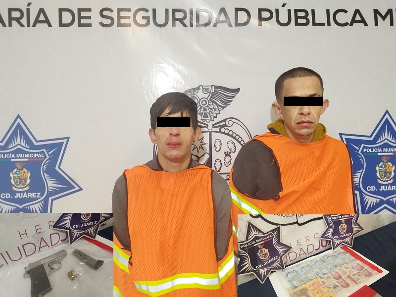 Ciudad Juárez, Chihuahua – Elementos de la Secretaría de Seguridad Pública Municipal arrestaron a Brandon Leonel R. y Giovanni Isaac Z. O, por su presunta responsabilidad en la comisión del delito de robo a casa comercial con violencia, violación a la ley federal de armas de fuego y explosivos y desobediencia y resistencia de particulares.