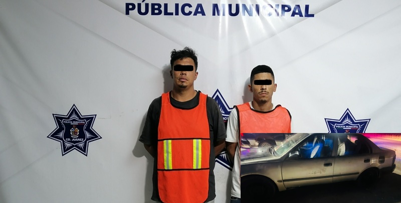 Ciudad Juarez, Chihuahua – Elementos de la Secretaría de Seguridad Pública Municipal arrestaron a Luis Martín Q. M. de 25 años y Brayan Misael G. C., por su presunta responsabilidad en la comisión de los delitos de posesión de vehículo con reporte de robo y contra la salud.
