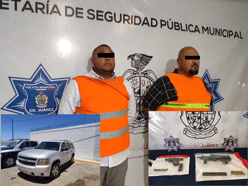 Ciudad Juárez, Chihuahua – Elementos de la Secretaría de Seguridad Pública Municipal arrestaron a Christian Iván E. E. y Alonso S. G. por su presunta responsabilidad en la comisión de delitos contra la ley federal de armas de fuego y explosivos.