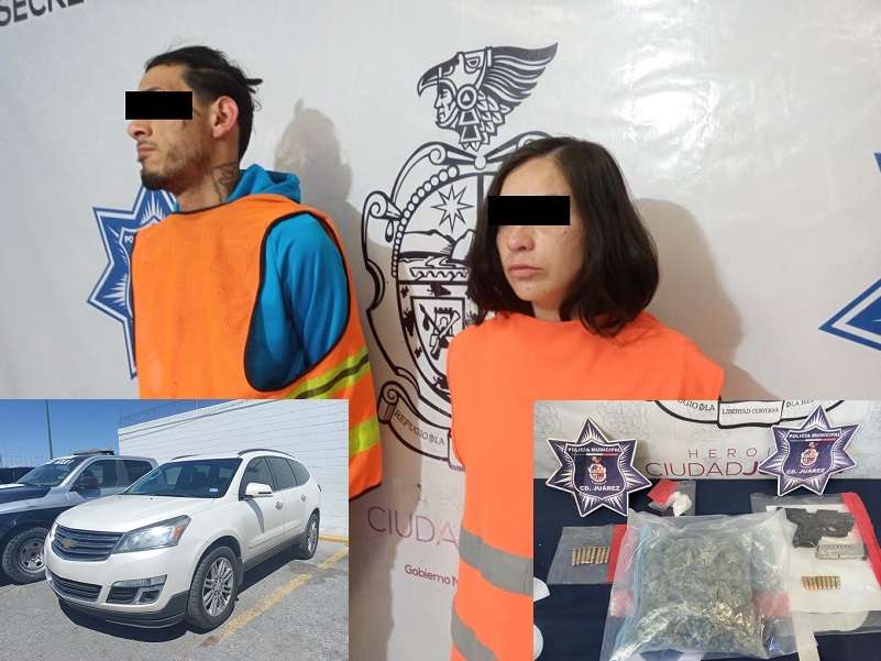 Ciudad Juárez, Chihuahua – Elementos de la Secretaría de Seguridad Pública Municipal arrestaron a José Juan Z. C. y Mayra M., por su presunta responsabilidad en la comisión de delitos contra la salud y violación a la ley federal de armas de fuego y explosivos.