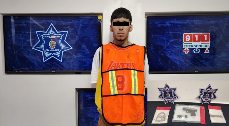 Ciudad Juarez, Chihuahua – Elementos de la Secretaría de Seguridad Pública Municipal, arrestaron a Miguel Ángel M. R., por su presunta responsabilidad en la comisión de delitos contra la ley federal de armas de fuego y explosivos, mismo que será investigado por causar lesiones a un hombre con proyectil de arma de fuego días atrás.