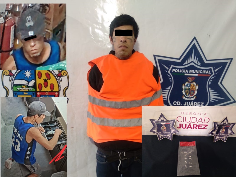 Ciudad Juarez, Chihuahua – Elementos de la Secretaría de Seguridad Pública Municipal arrestaron a Israel Andrés D. G., por su presunta responsabilidad en la comisión de delitos contra la salud, mismo que será investigado por robo en varios negocios.