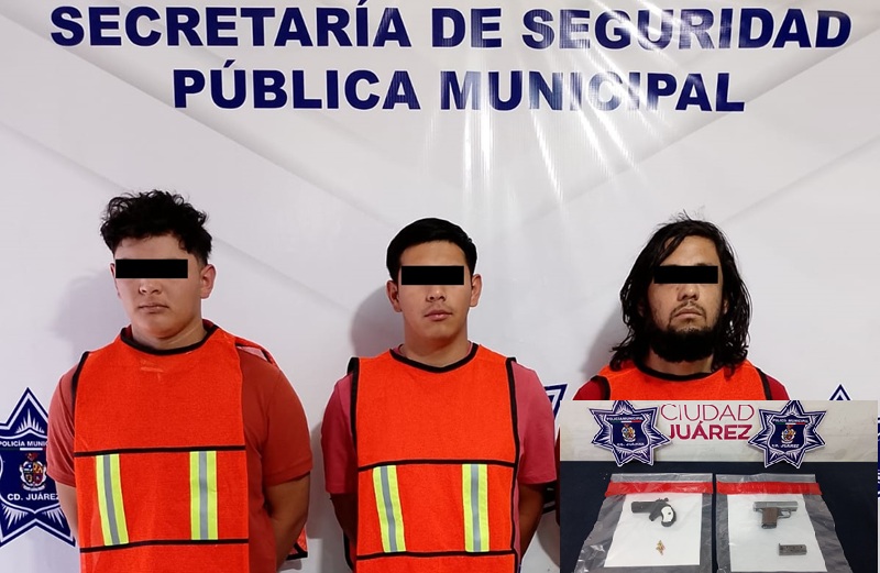 Ciudad Juarez, Chihuahua – Elementos de la Secretaría de Seguridad Pública Municipal arrestaron a Ken Fernando B. H., Gustavo Adrián H. J. y Fernando l. V., por su presunta responsabilidad en la comisión de delitos contra la ley federal de armas de fuego y explosivos.