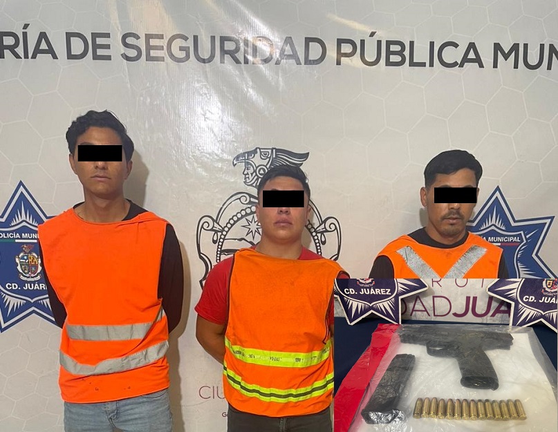 Ciudad Juárez, Chihuahua – Elementos de la Secretaría de Seguridad Pública Municipal arrestaron a Jesús Uriel R. R., Noé Misael R. R. y Humberto S. M., por su presunta responsabilidad en la comisión del delito de violación a la ley federal de armas de fuego y explosivos.