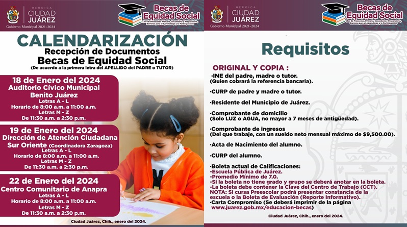 El beneficiado debe estudiar en una escuela pública de la ciudad, tener un promedio mínimo de 7.0 y si cursa el preescolar es necesario presentar constancia de la escuela o boleta de evaluación. También es importante entregar una carta compromiso que se podrá imprimir en la página www.juarez.gob.mx/educacion-becas