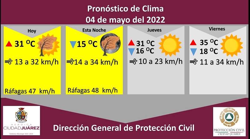 Ciudad Juárez, Chihuahua – La Dirección de Protección Civil municipal, con base en informes del Servicio Meteorológico Nacional, emite una alerta amarilla para este miércoles debido a fuertes ráfagas de viento que podrían alcanzar los 48 kilómetros por hora, con posibilidad de polvaredas dispersas.