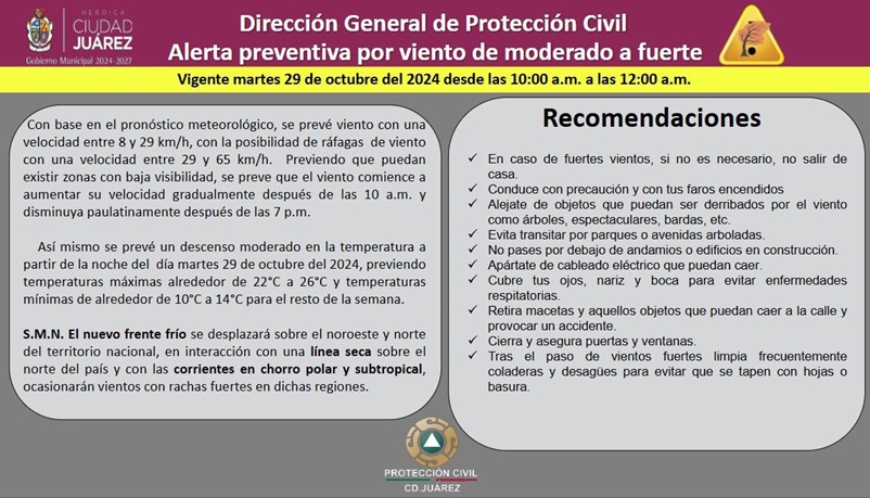 Ciudad Juarez, Chihuahua – La Dirección General de Protección Civil de Ciudad Juárez emitió una alerta preventiva por vientos de moderados a fuertes, vigente para el martes 29 de octubre de 2024, desde las 10:00 a.m. hasta las 12:00 a.m. del día siguiente. Se prevén vientos con velocidades de entre 8 y 29 km/h, y ráfagas que podrían alcanzar entre 29 y 65 km/h. Las ráfagas más intensas se esperan a partir de las 10:00 a.m., disminuyendo gradualmente después de las 7:00 p.m.