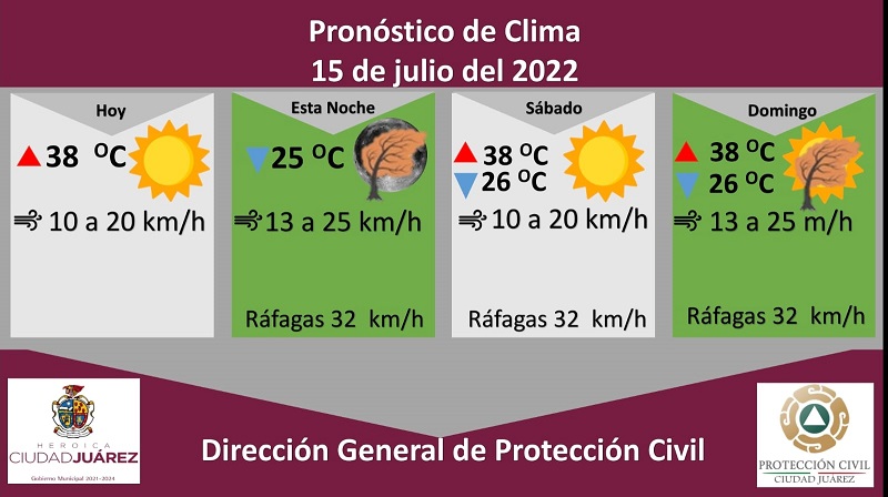 Ciudad Juárez, Chihuahua – Con base en informes del Servicio Meteorológico Nacional, la Dirección General de Protección Civil emite una alerta verde para este viernes, debido a fuertes ráfagas de viento que podrían alcanzar los 32 kilómetros por hora, dio a conocer Roberto Briones Mota, titular de la dependencia.