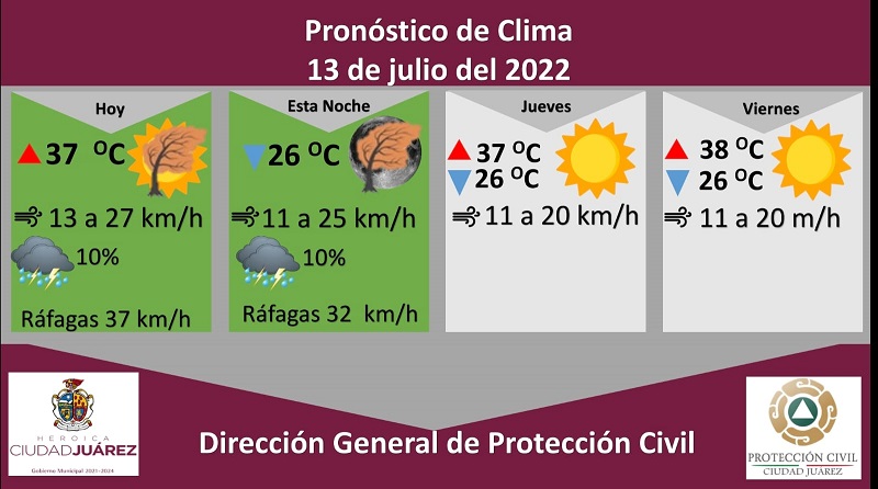 Ciudad Juárez, Chihuahua – La Dirección General de Protección Civil emite una alerta verde para este miércoles, debido a fuertes ráfagas de viento que podrían alcanzar los 37 kilómetros por hora, además existe una probabilidad de lluvia y tormentas eléctricas aisladas de un 10 por ciento, las cuales se pueden presentar después de la 1:00 de la tarde.