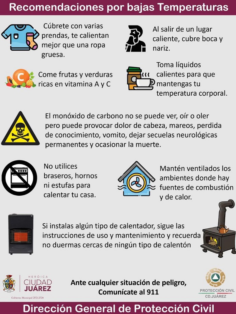 Ciudad Juárez, Chihuahua – La Dirección General de Protección Civil emitió una serie de recomendaciones a la ciudadanía, debido al descenso de temperaturas que se presentarán en los próximos días, ya que durante el fin de semana se espera la caída de nieve o aguanieve, mencionó Roberto Briones Mota, titular de la dependencia.