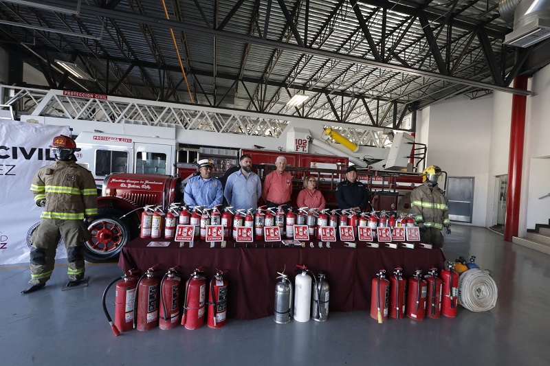 Ciudad Juárez, Chihuahua – El Departamento de Bomberos recibió la donación de extintores, equipo y señalización por parte de la empresa “Extintores y Equipo contra Incendio OK”, que fueron recibidos por Roberto Briones Mota, titular de la Dirección General de Protección Civil y Sergio Rodríguez, comandante de Bomberos.