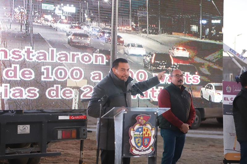 Ciudad Juarez, Chihuahua – Este día el alcalde Cruz Pérez Cuéllar encendió oficialmente 718 luminarias de tecnología led a lo largo de 9.8 kilómetros de la avenida De Las Torres abarcando el tramo del bulevar Manuel Gómez Morín hasta el bulevar Independencia con una inversión de $58,517,633.43.