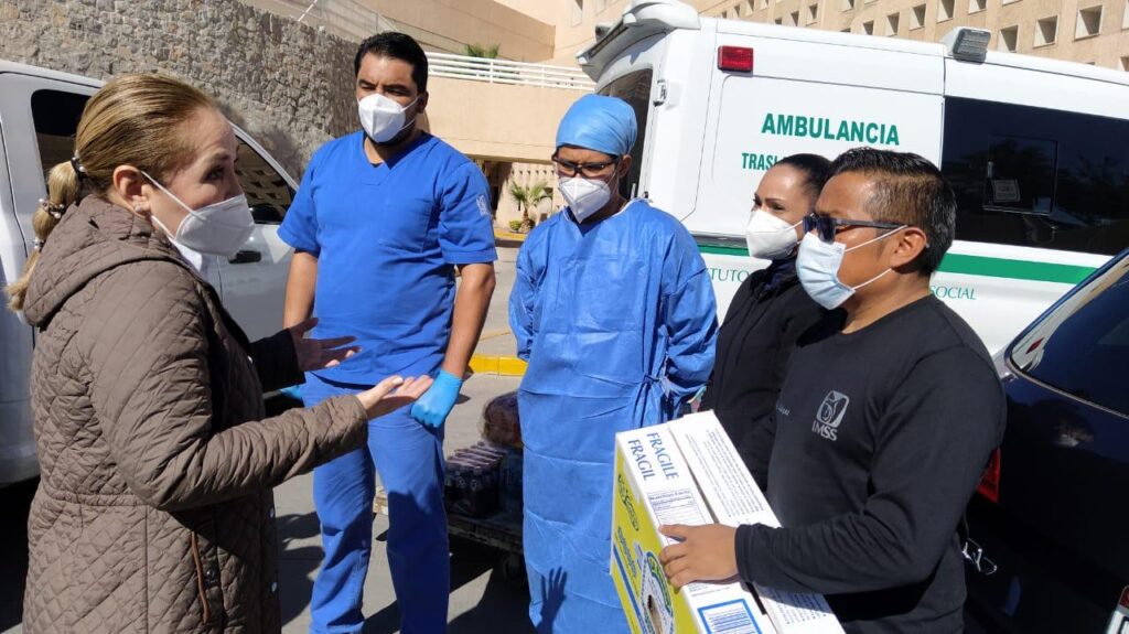Ciudad Juárez, Chihuahua.- Adriana Fuentes Téllez, encabezo este viernes la entrega de los primeros insumos para todo el personal de la salud, dentro de la campaña “Héroes de la Salud, Juárez nos necesita a todos”.